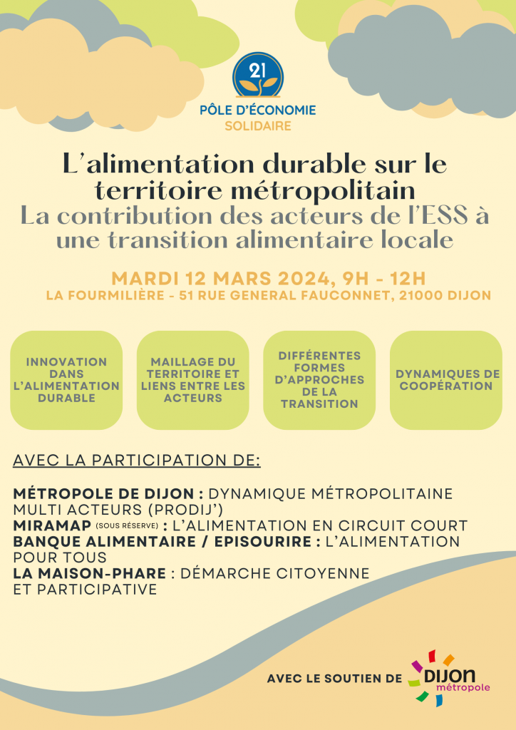 Pour s’inscrire à l’évènement : https://www.helloasso.com/associations/pole-d-economie-solidaire-21/evenements/evenement-12-mars-2024-alimentation-durable-et-acteurs-de-l-ess-dijon
