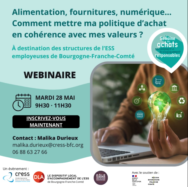 La CRESS BFC, le Pôle ressources IAE et les DLA de la région BFC coorganisent un webinaire pendant la semaine des ASER à destination des structures employeuses de l’ESS de la région pour les sensibiliser sur leurs achats. ![]()
